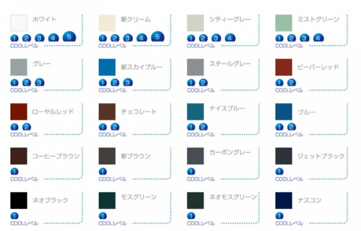 色見本の下にそれぞれ①~⑤までの熱反射率を表した数字が記載されています。