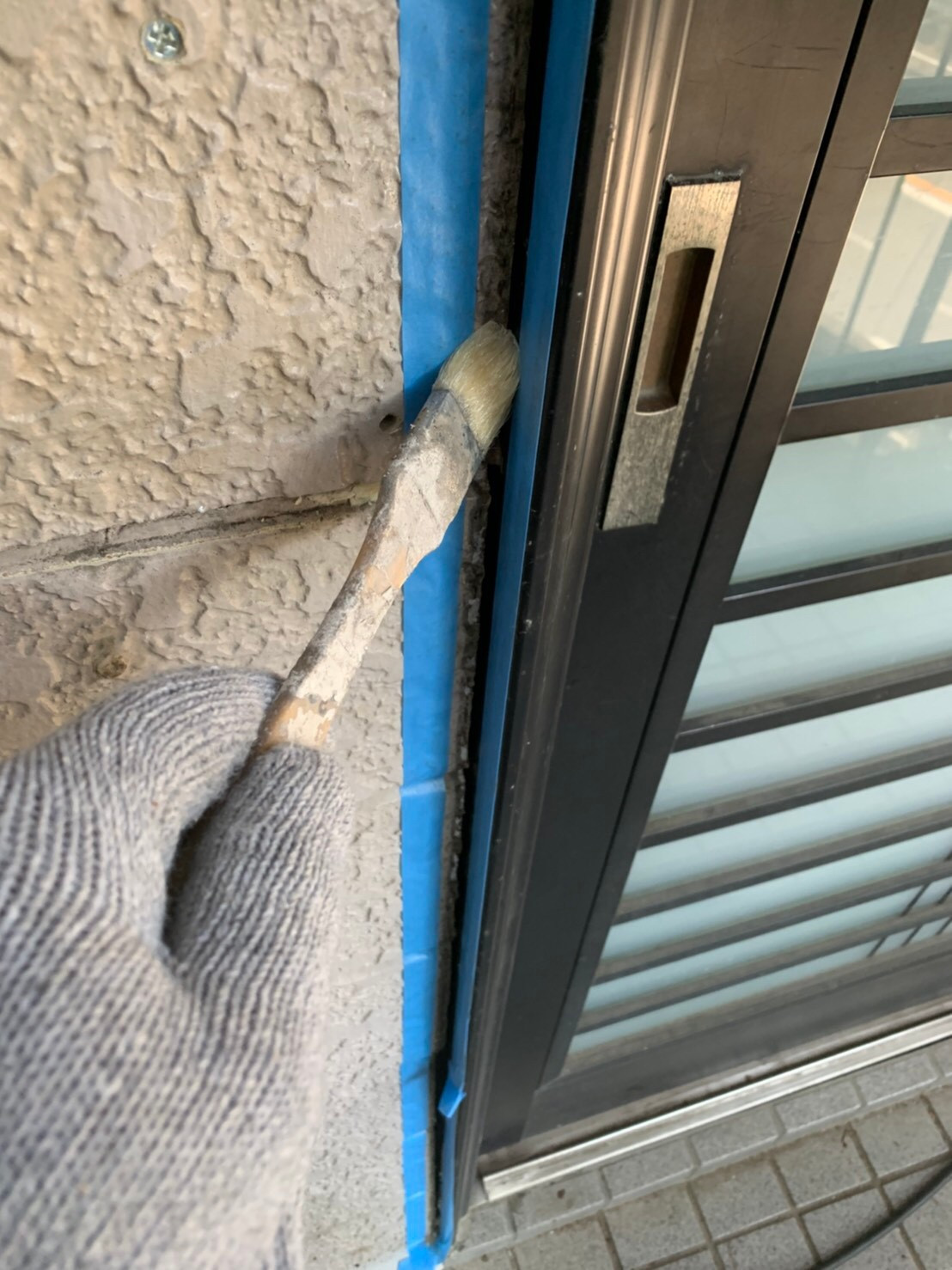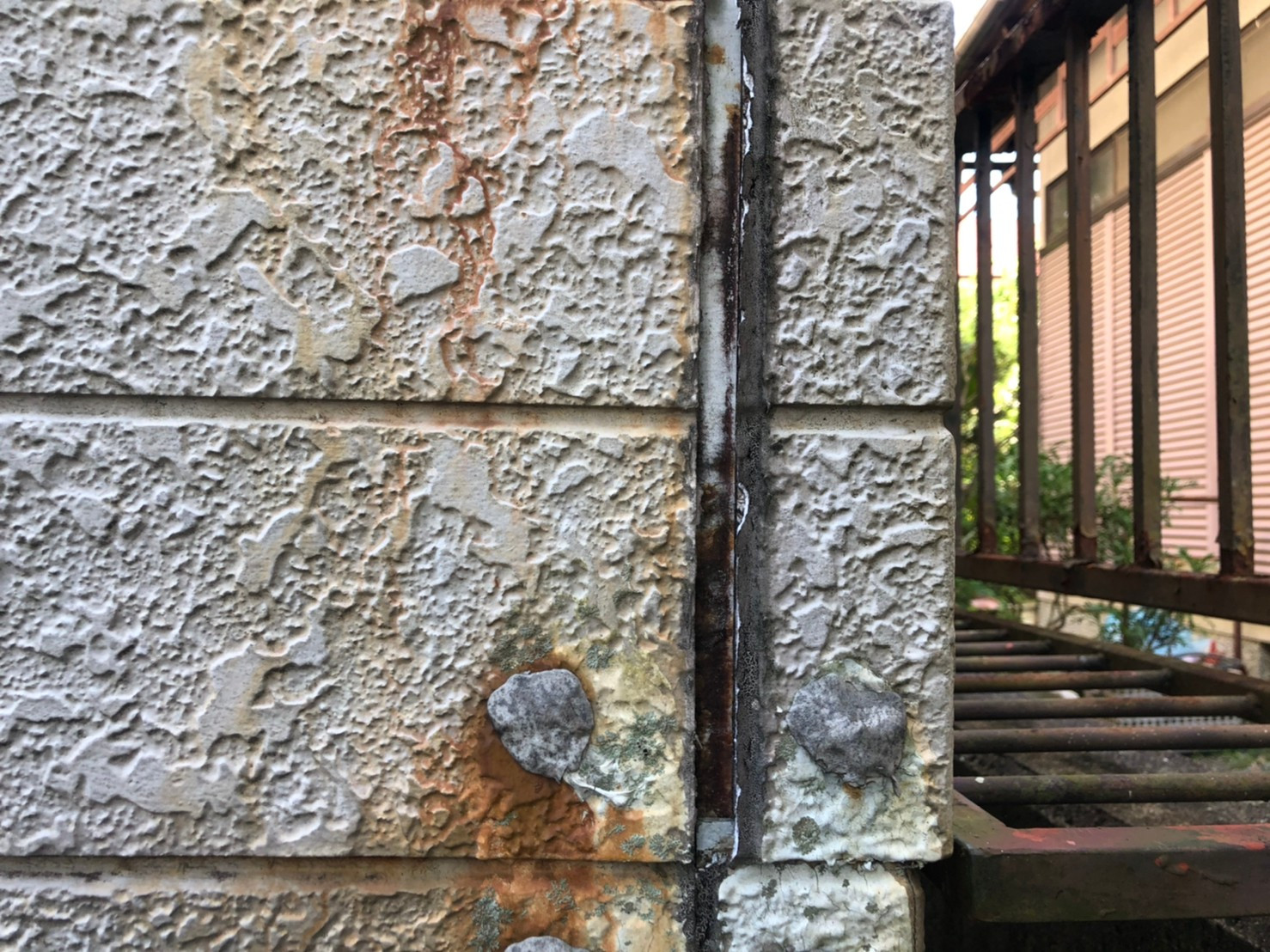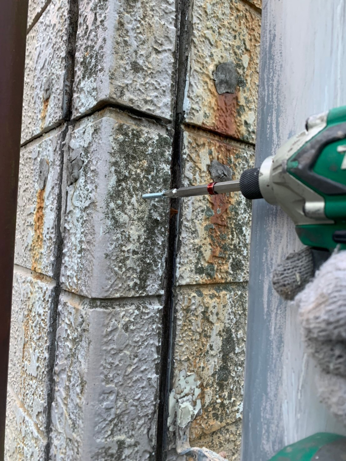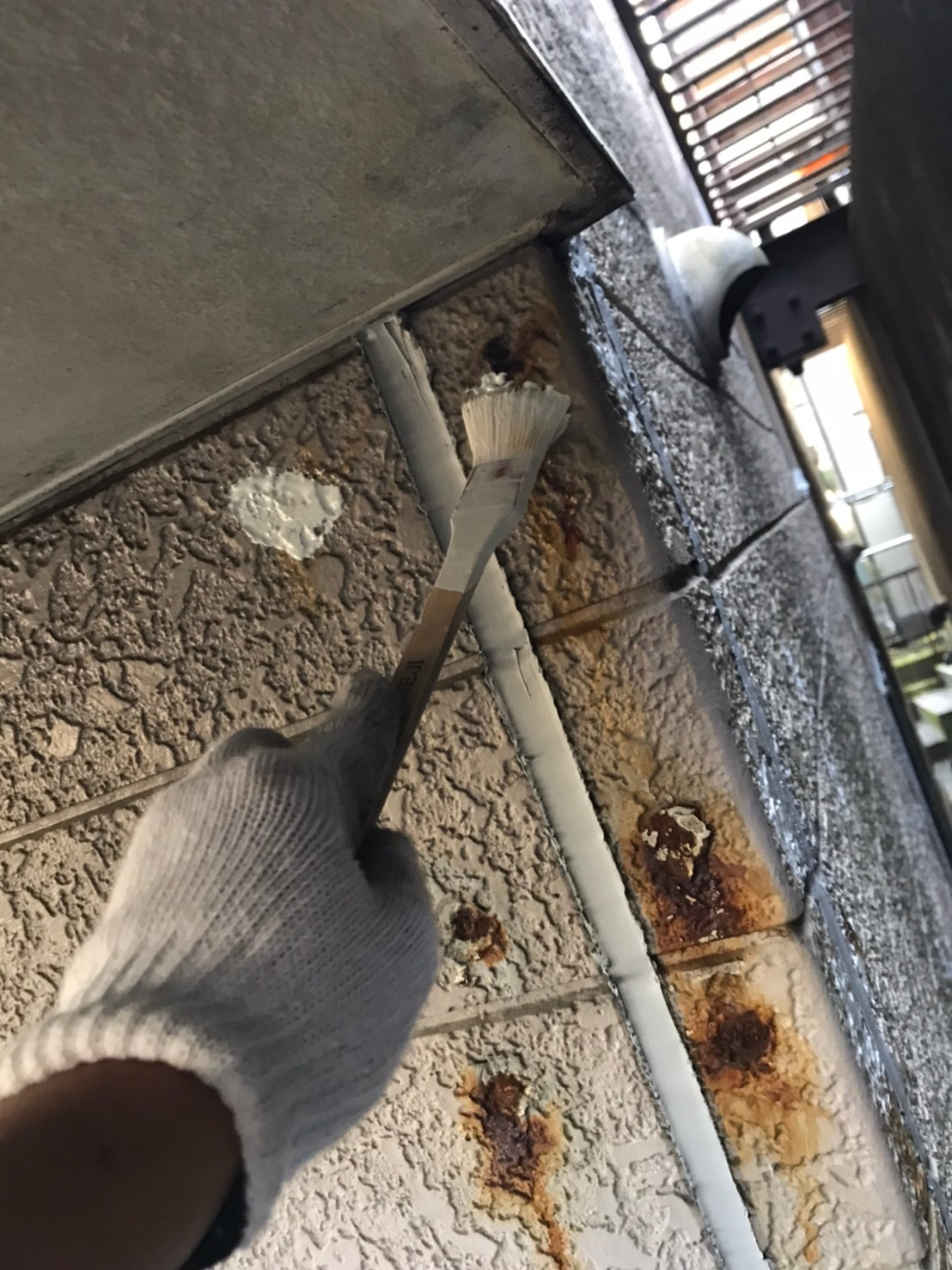 既存のパテを撤去し、錆びが出てきているので錆止めを塗っていきます。