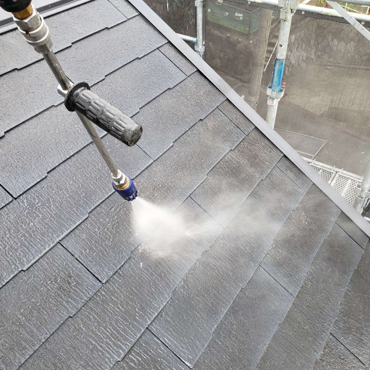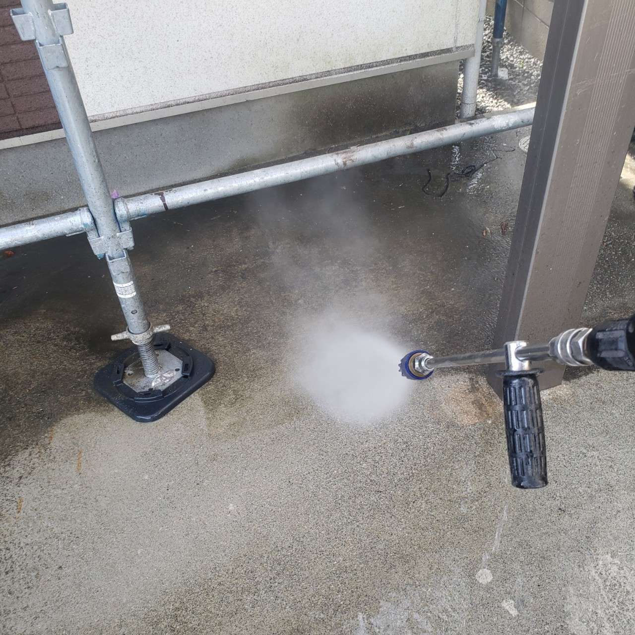 足場を組み終わると次は高圧洗浄をしていきます