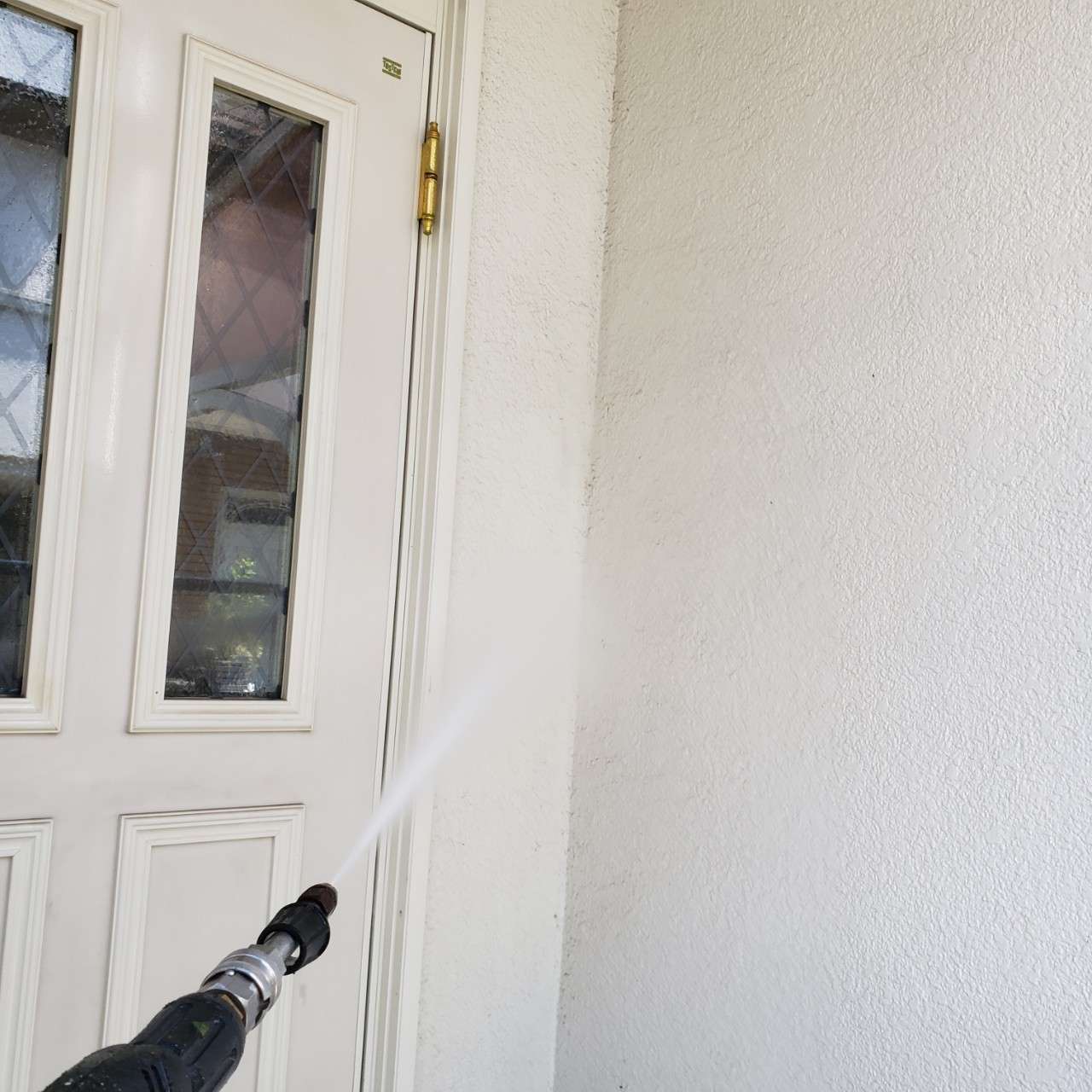 まずは高圧洗浄で外壁や土間の汚れを綺麗に洗い流していきます