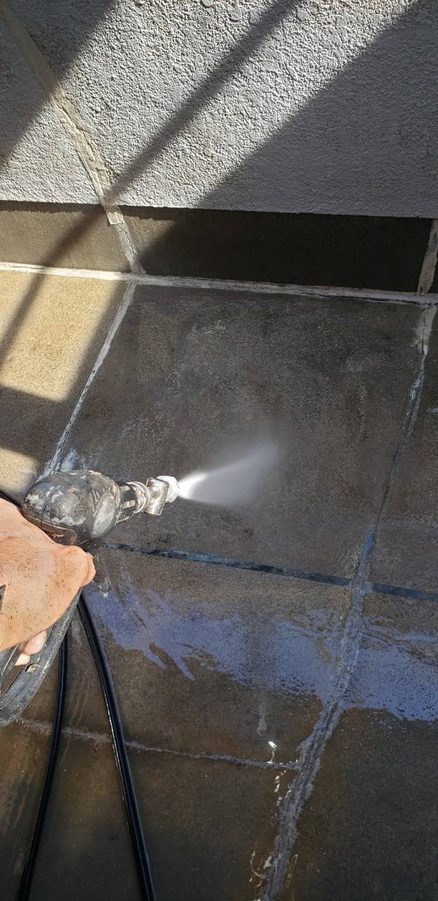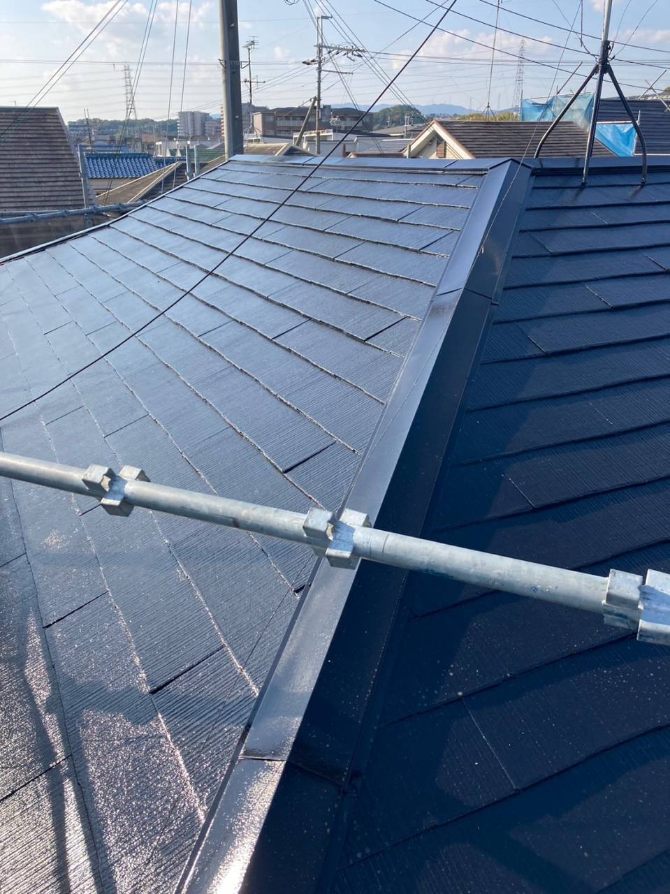 屋根は高圧洗浄で汚れや苔、劣化した旧塗膜を除去し